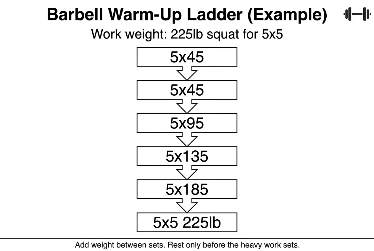A simple barbell warm-up ladder looks like this (example for a 100kg squat work weight):