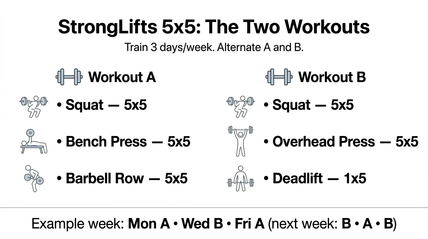 StrongLifts 5x5 is a barbell program built around two alternating workouts, performed three days per week. Most lifts are 5 sets of 5 reps (“5x5”), while the deadlift is typically 1 heavy set of 5 reps after warm-ups.