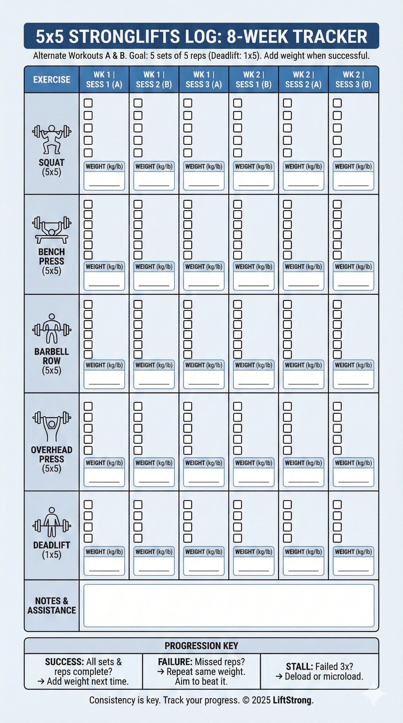 StrongLifts is technically “workout-to-workout” progression (not a fixed week-by-week percentage plan). But for most people, an 8-week block looks like this: