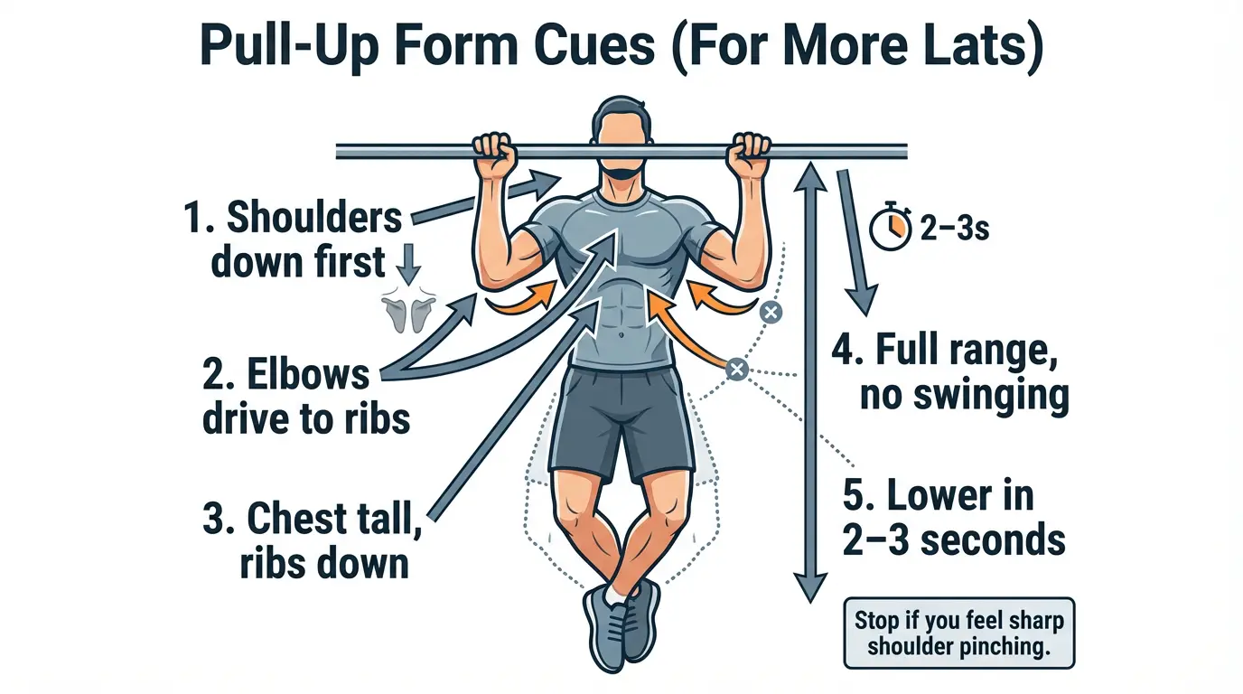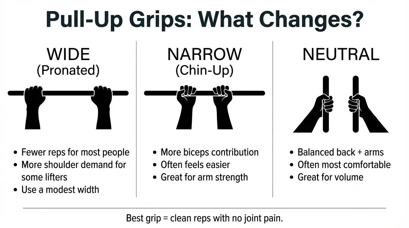 | Wide (pronated) | Hands well outside shoulders | Upper-back feel / lat “stretch” (varies) | Harder, fewer reps | Higher for some shoulders |