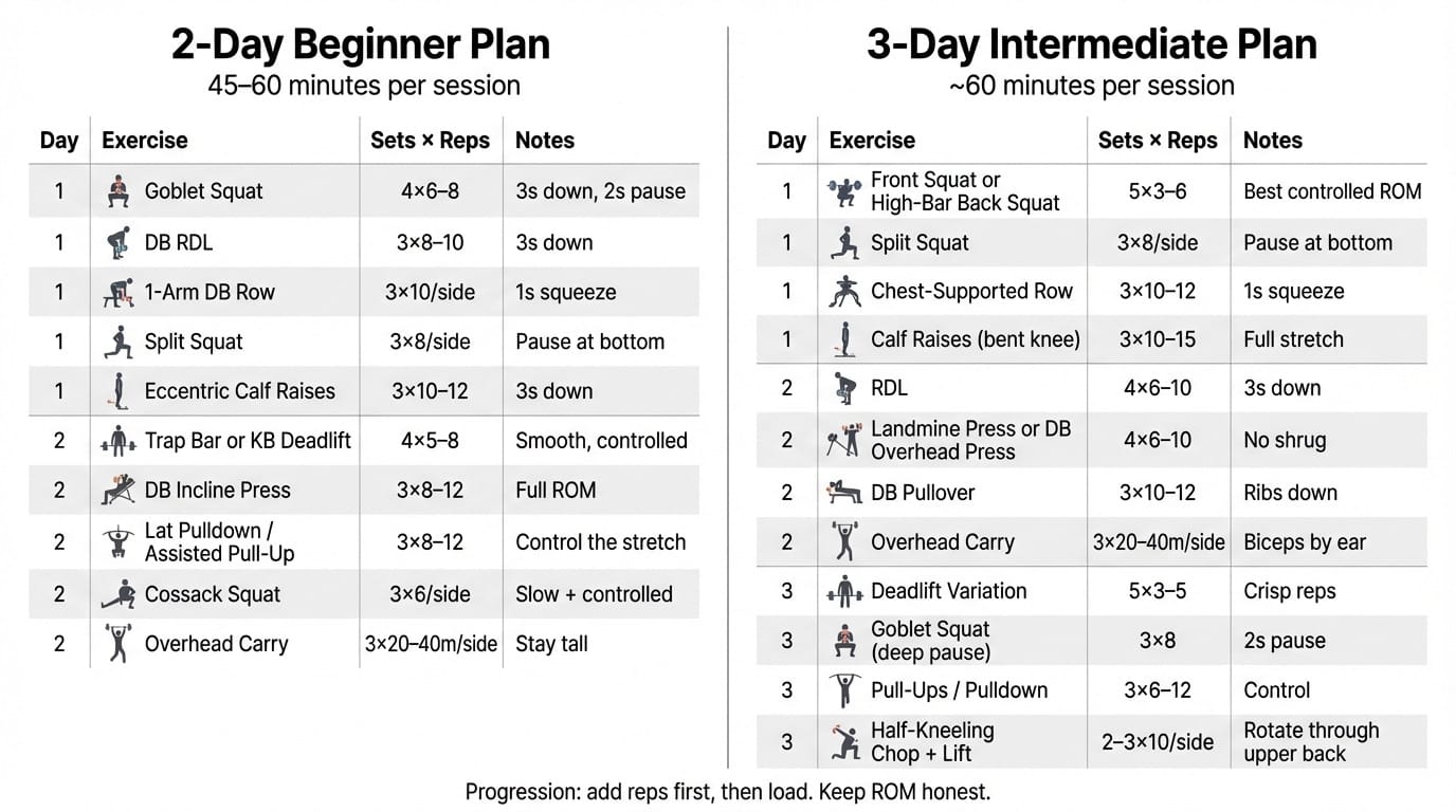 - Pick 2–3 problem zones (commonly ankles, hips, thoracic spine, shoulders) and bias your exercise selection toward them.